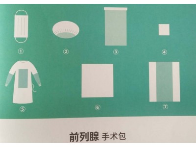 手术包配置:一次性使用医用口罩1个、一次性使用帽1个、器械盘套1条、擦毛巾(40*40)4块、一次性使用手术衣(加强型)2件、TUR前列腺手术单1条、一次性使用包布1条、