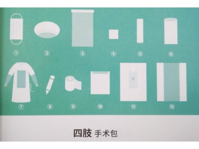 手术包配置:一次性使用医用口罩1个、一次性使用帽1个、器械盘套1条、擦手巾(40*40cm)2块、软质胶套1个、一次性使用手术衣(加强型)2件、医用记号笔1支、弹性绷带1卷、边单4条、四肢单1条、一次性使用包布1条。