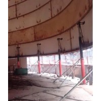5、注意由于此时刚换完吊点后,钢内筒的提升吊点位于筒体重心下部,筒体处与“头重脚轻”状态,为防止提升时筒体发生晃动或倾斜,所以要有一套的止晃措施。