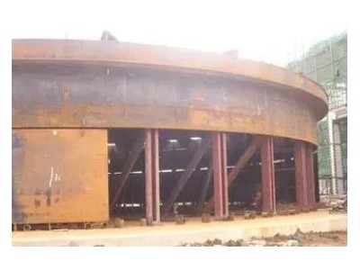 在第1圈壁板安装时,临时大门处要安装临时壁板(临时壁板厚度≥16mm,宽度与正式壁板相同),四周用H型钢(H型钢型号一般要大于H300)分段焊接加固。